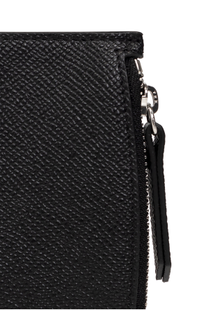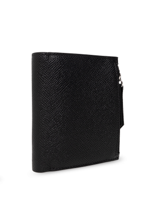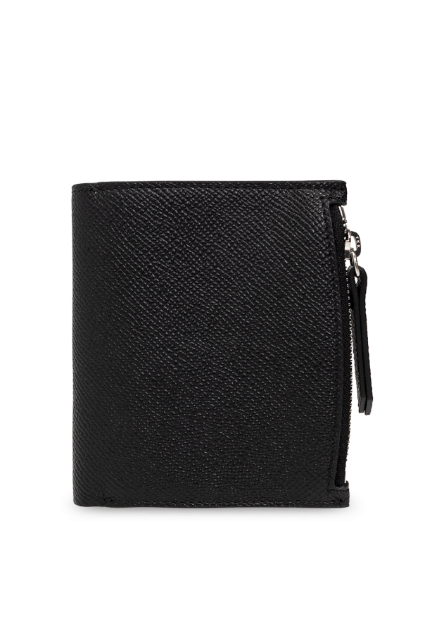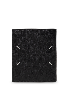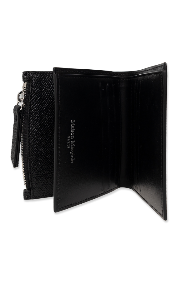 Black bi-fold wallet from Maison Margiela. Crafted from grainy calf leather, this design showcases the brand's signature white four-stitches moniker at the back, one zip coin pocket and a bill compartment, two slip pockets and six card slots inside.