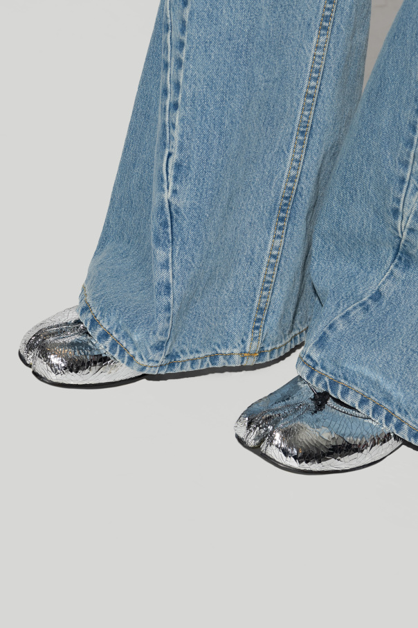 Blue jeans from Maison Margiela. This high-waisted pair features a zip and button fastening, multiple pockets, the brand’s signature white stitches and straight, wide legs with stitches.