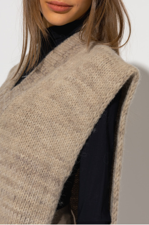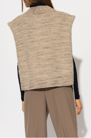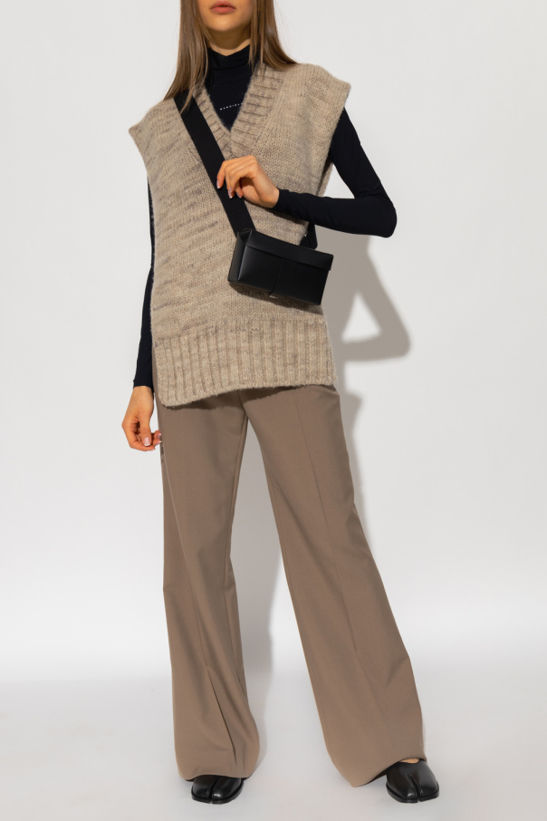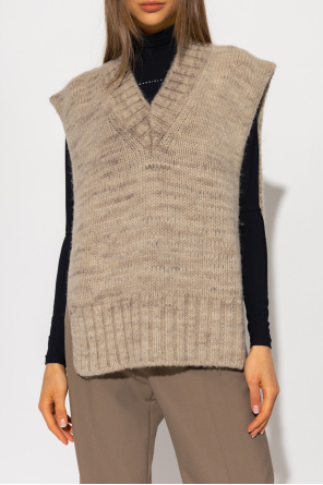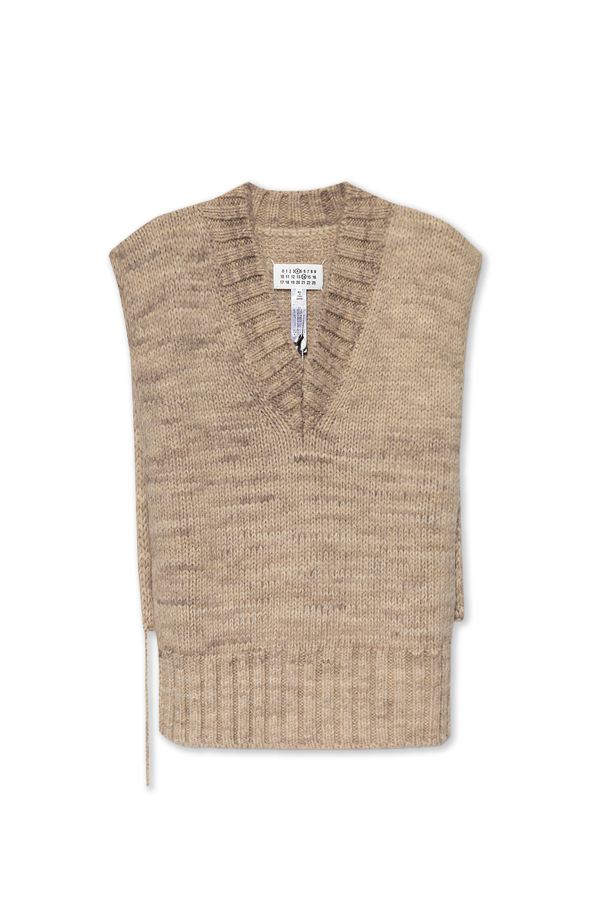 Beige vest from Maison Margiela. Made of an alpaca, cotton and wool blend, this V-neck design features a tie on the side, white logo embroidery at the back and ribbed trims at the neck and hem.