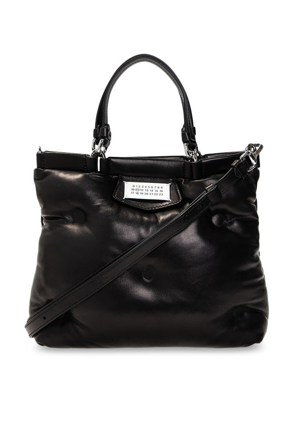 Maison Margiela的黑色调棉絮单肩包。皮革质。附磁性按扣。正面附黑白logo配件。两个半圆形手柄。可拆卸可调节饰带。银色调金属配件。内部附一个隔层及一个拉链袋。