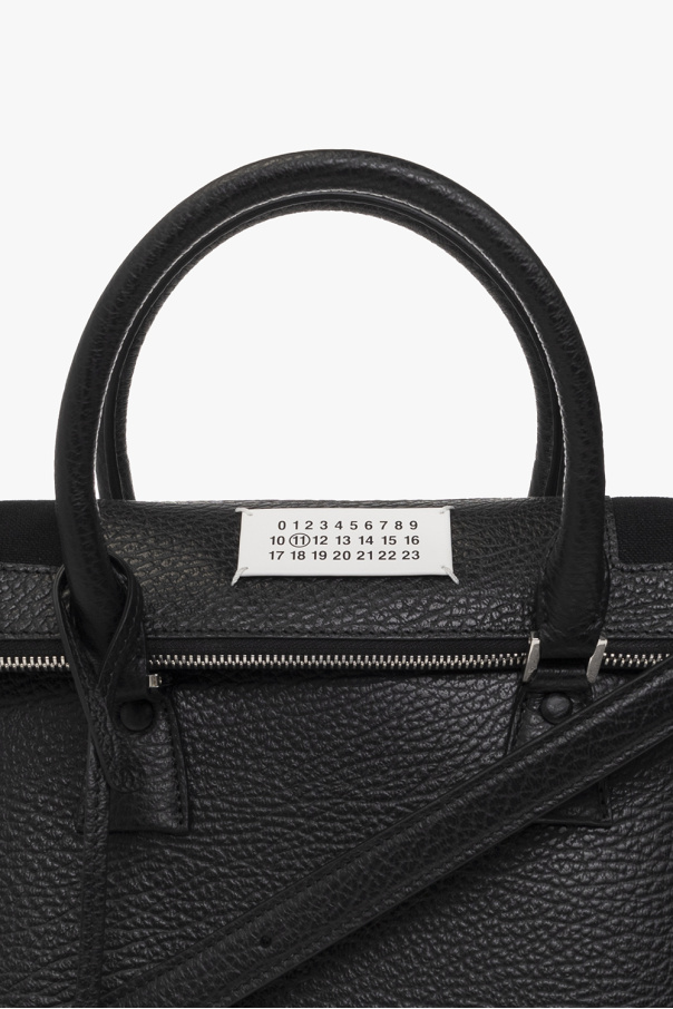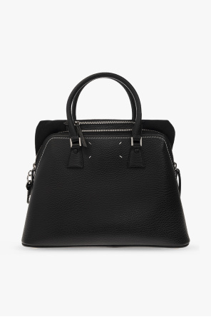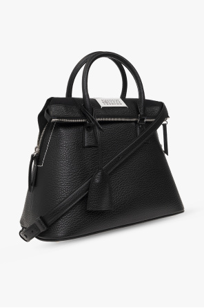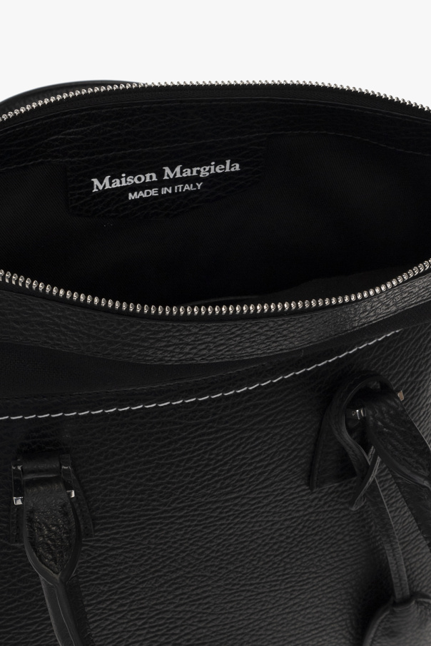 Maison Margiela的黑色'5AC Medium'皮革质单肩包。附拉链开合。饰有白色和黑色徽标贴片、两个半圆形提手、可拆卸肩带、银色金属配件以及一个带一个插袋和一个拉链袋的内部隔层。