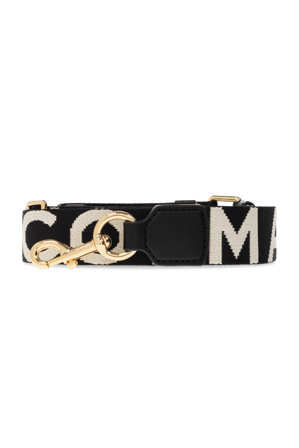 Black and white adjustable bag strap from Marc Jacobs. Made of fabric with leather trims, this item features an embroidered logo pattern and gold-tone metal carabiner clips.