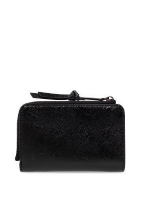 Black wallet from Marc Jacobs. Made from Saffiano leather, this design secures with a zip and snap and showcases a black metal logo plaque. It is complete with a slip pocket on the front, black metal applications as well as six card slots and two slip pockets inside.