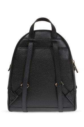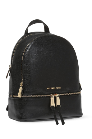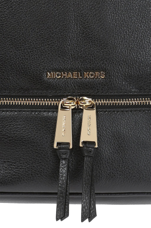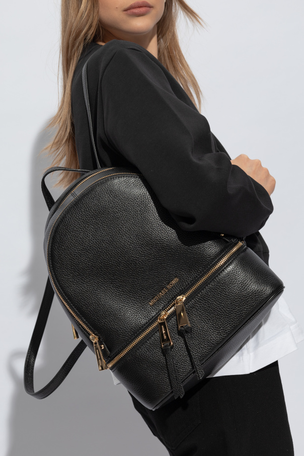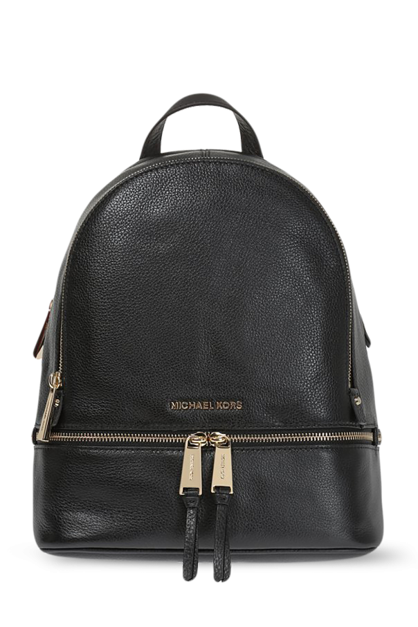 迈克尔·迈克高仕( Michael Kors) (Michael Michael Kors)的黑色'Rhea Zip' 背包。纹理小牛皮制成。2个独立的拉链隔层。里面有1个拉链口袋和1个可拆卸口袋。前面有金属logo和额外的拉链口袋。半圆形皮革手柄。可调皮革肩带。