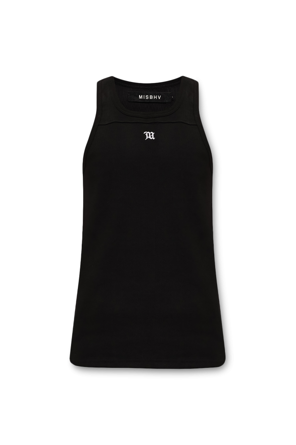 MISBHV 黑色罗纹无袖T恤。由棉制成。饰有白色刺绣徽标图案。圆领饰有贴边。