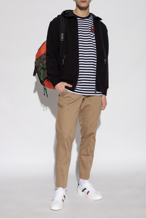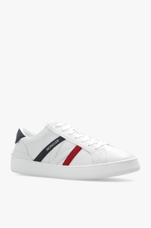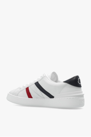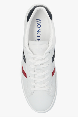 White ‘Monaco’ sneakers from Moncler. Crafted from faux leather, this lace-up model sits on a white rubber sole and showcases the brand's logo on the tongue, side and back and navy blue and red stripes applied on the sides.