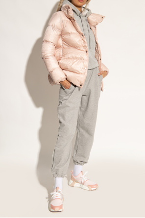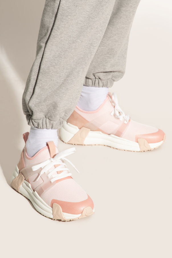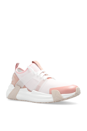 Pink and white ‘Lunarove’ sneakers from Moncler. Made of leather and fabric, this lace-up pair features an embossed logo and rubber sole in pink and white.