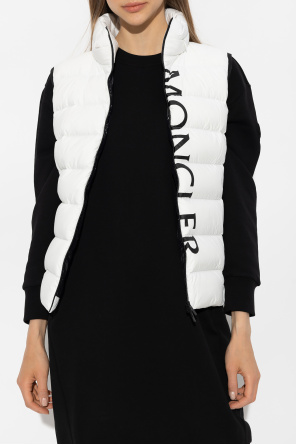 White and black ‘Cenis’ down vest from Moncler. Fastened with a two-way zip, this design features a black logo print, two zipped front pockets and hidden hood.