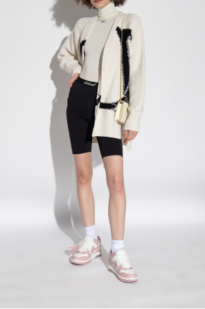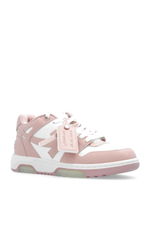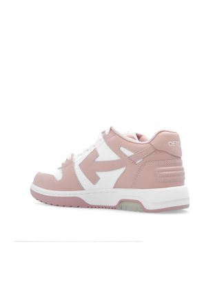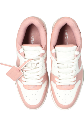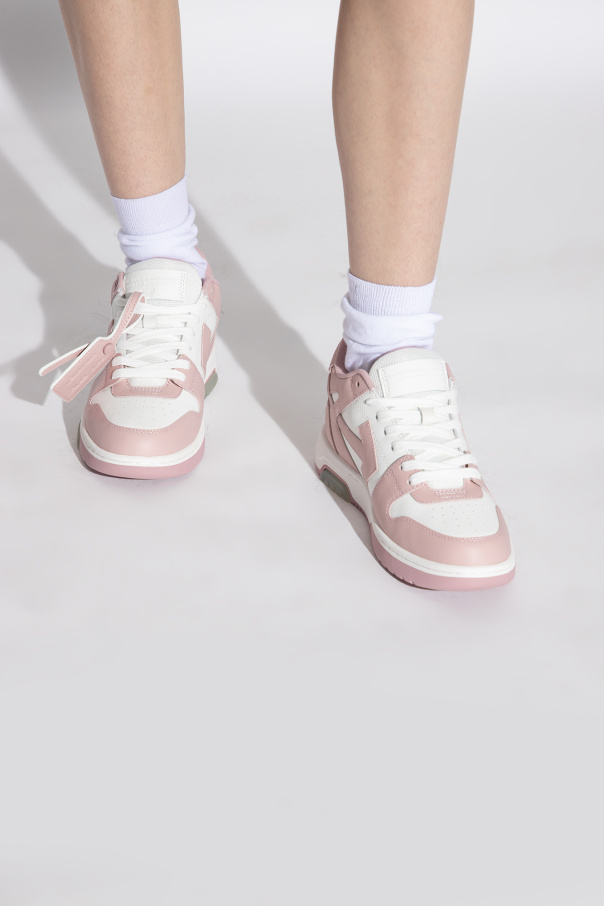 Off-White 粉色与白色'Out Of Office'运动鞋,系带设计,采用小牛皮制成,饰有织物饰边,正面饰有穿孔设计、品牌标志性箭头、鞋舌贴片、背面压花徽标、可拆卸拉链标签以及白色和粉色橡胶鞋底,配有透明嵌片。
