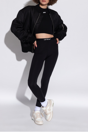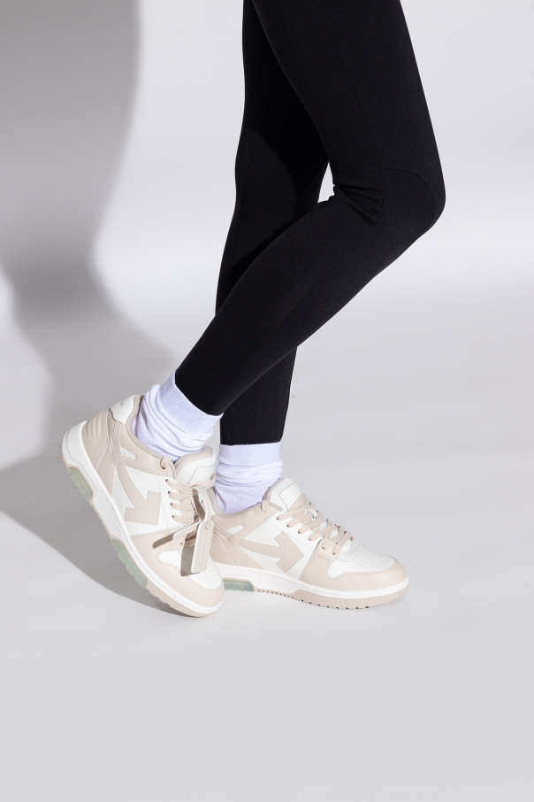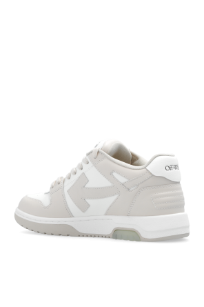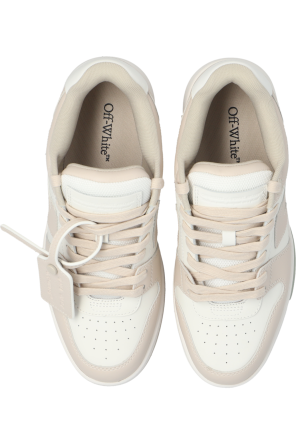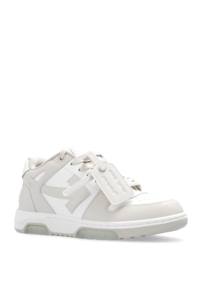 White and beige ‘Out Of Office’ sneakers from Off-White. Made of calf leather with fabric trims, this lace-up pair features a perforated front, the brand’s signature arrow on the side, tongue patch, embossed logo at the back, detachable zip tie tag and rubber sole in white and beige with transparent inserts.