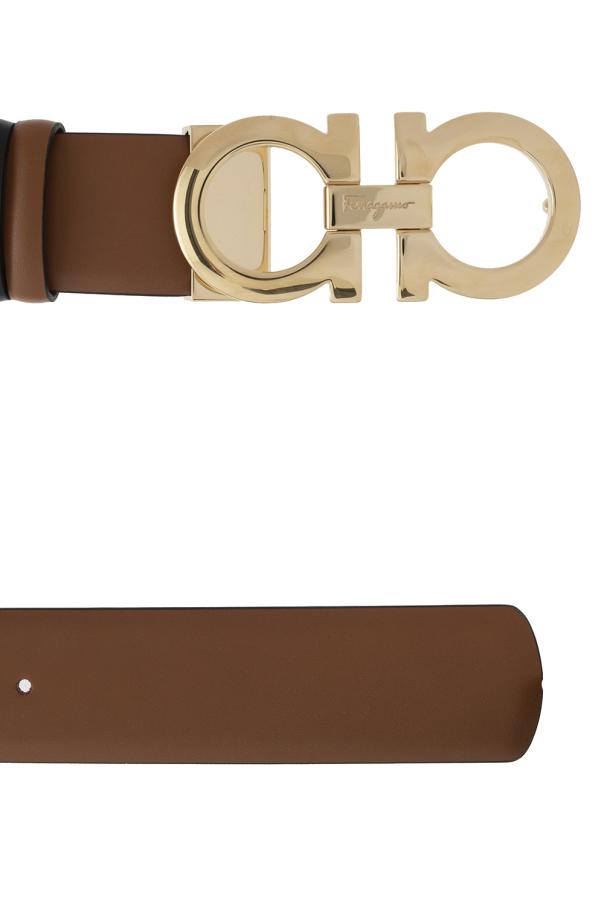 Salvatore Ferragamo 的棕色和黑色腰带。 这款单品采用小牛皮制成,配有金色徽标雕刻搭扣。