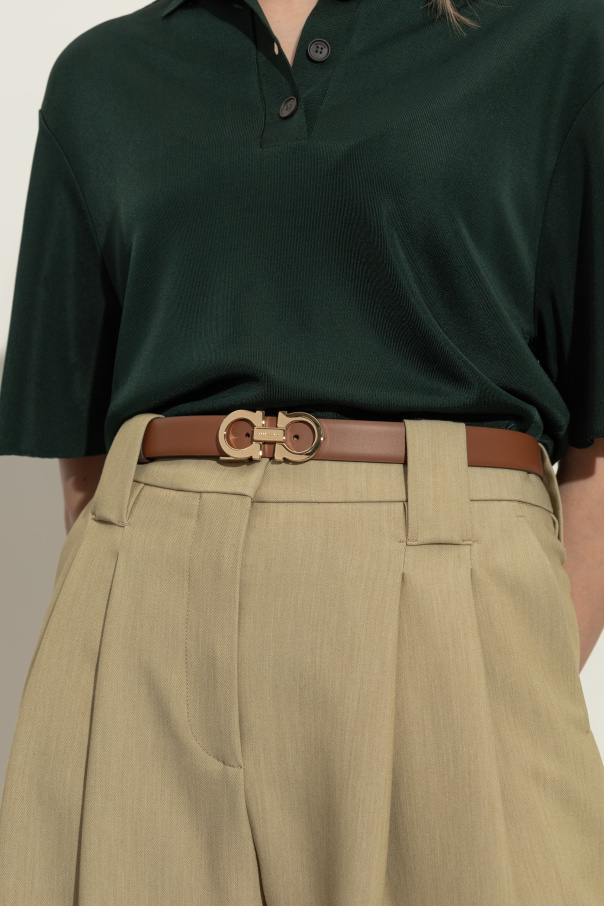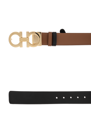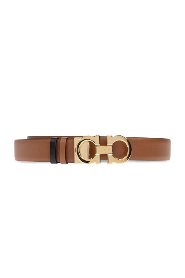 Salvatore Ferragamo 棕色和黑色双面腰带。 这款款式采用小牛皮制成,采用金色镌刻徽标搭扣固定。