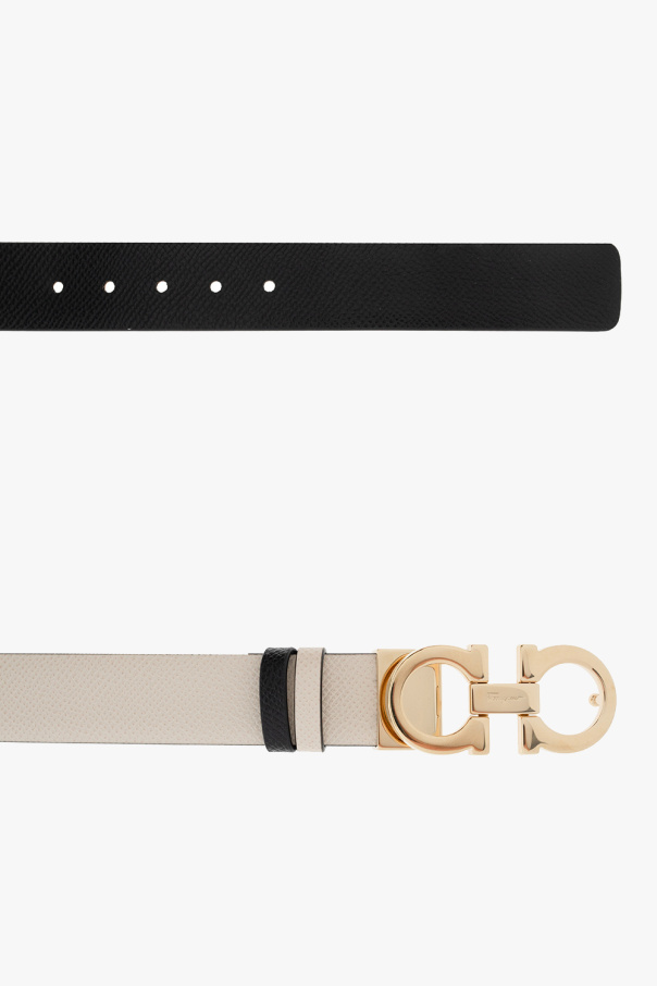 Salvatore Ferragamo的黑色和奶油色双面腰带,采用小牛皮制成,饰有金色金属质感的“Gancini”搭扣。