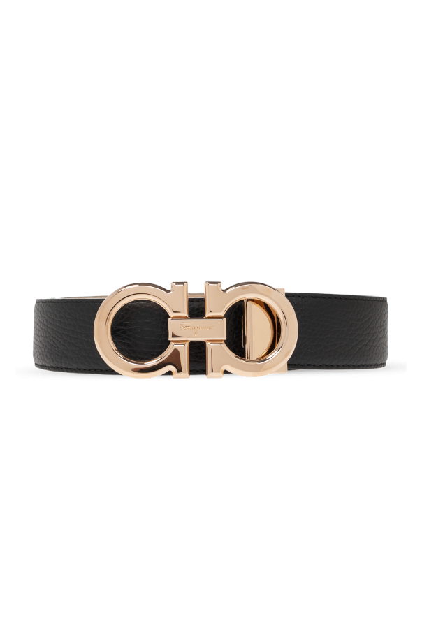 FERRAGAMO的黑色和米色双面腰带。采用纹理小牛皮制成,饰有品牌标志形状的金色搭扣。
