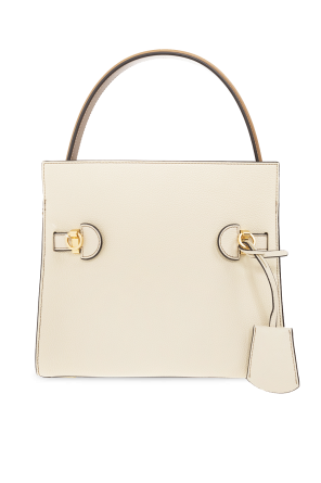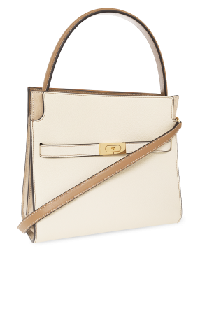 Cream and brown ‘Lee Radziwill Small’ shoulder bag from Tory Burch. Made of leather, this model features snap fastenings, the label’ signature ‘T-Lock’ closure with a leather strap, half-round handle, two detachable and adjustable shoulder straps, gold-tone metal hardware and one internal compartment with multiple pockets.
