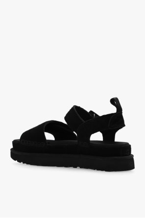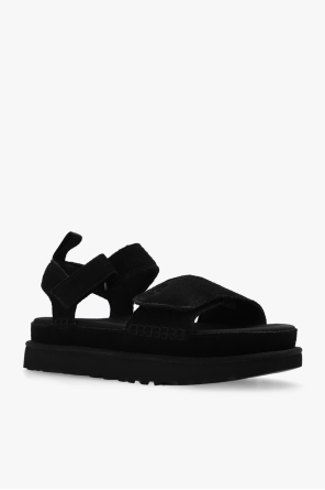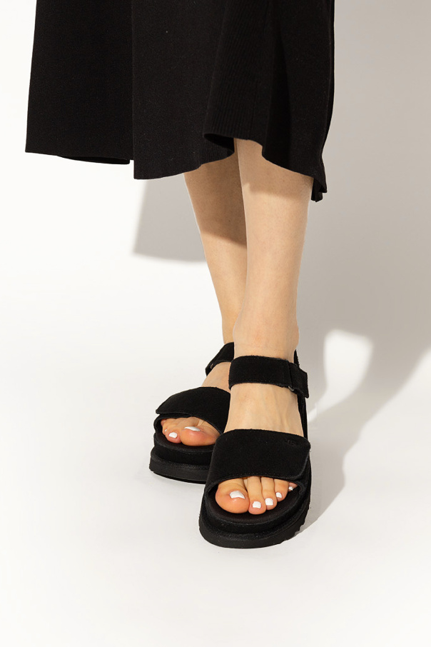 Black ‘Goldenstar’ platform sandals from UGG. Made of suede, this pair features velcro straps, embossed logo on the side as well as a black rubber and EVA SugarSole™.