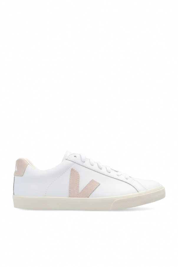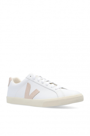 White ‘Esplar Logo’ sneakers from Veja. Made from leather, this lace-up model features a logo printed on the tongue and organic cotton laces. The mesh inner lining made from recycled materials was developed to acquire a better resistance to friction. The organic-sourced and recycled insole is made from sugar cane, Amazon rubber, organic cotton and recycled EVA foam. It is set on a cream rubber sole made of organic and recycled materials.