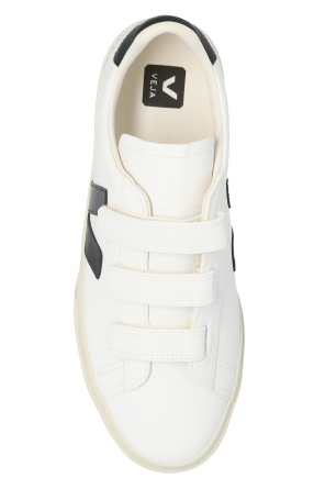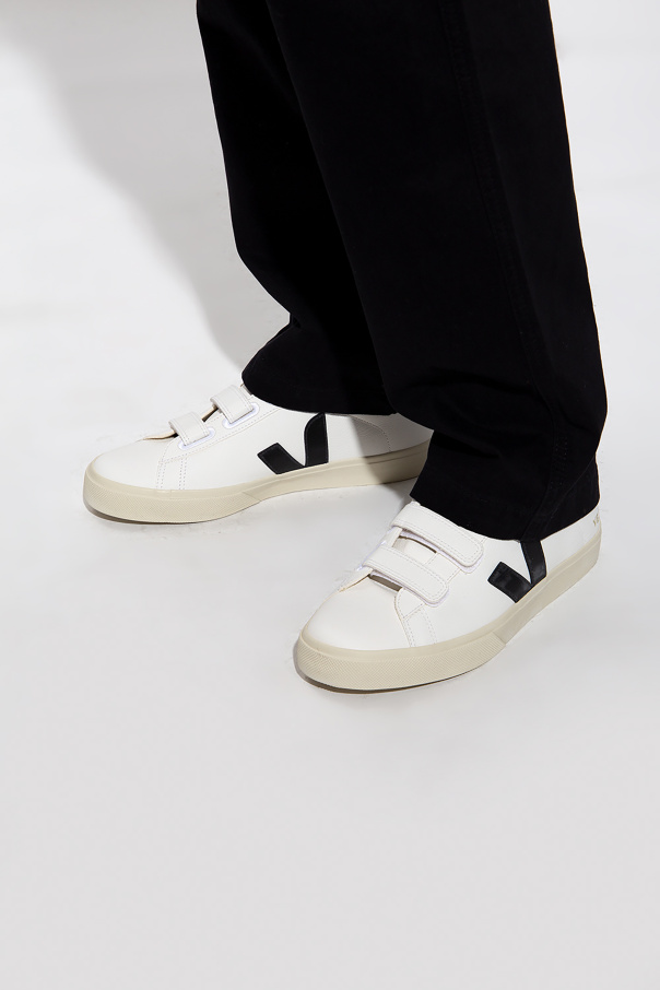 White ‘Recife Logo’ sneakers from Veja. Crafted from chrome-free leather with distressed details, this model features an embossed logo on the tongue, triple velcro closures and a signature black logo patch produced from rubber and rice waste. The mesh inner lining made from recycled materials was developed to acquire a better resistance to friction. The organic-sourced and recycled insole consists of sugar cane, Amazon rubber, organic cotton and recycled EVA. It is set on a cream rubber sole made from organic and recycled materials.