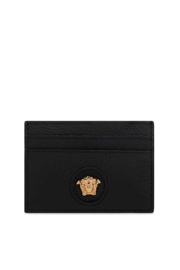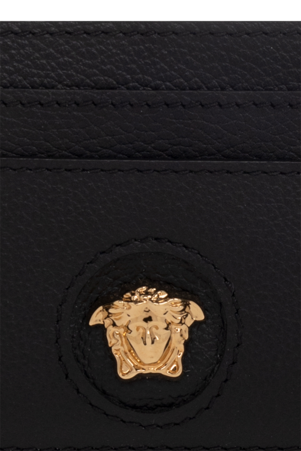 Versace 黑色卡包,采用皮革制成,饰有品牌标志性美杜莎头像、金色徽标印花和五个卡位。