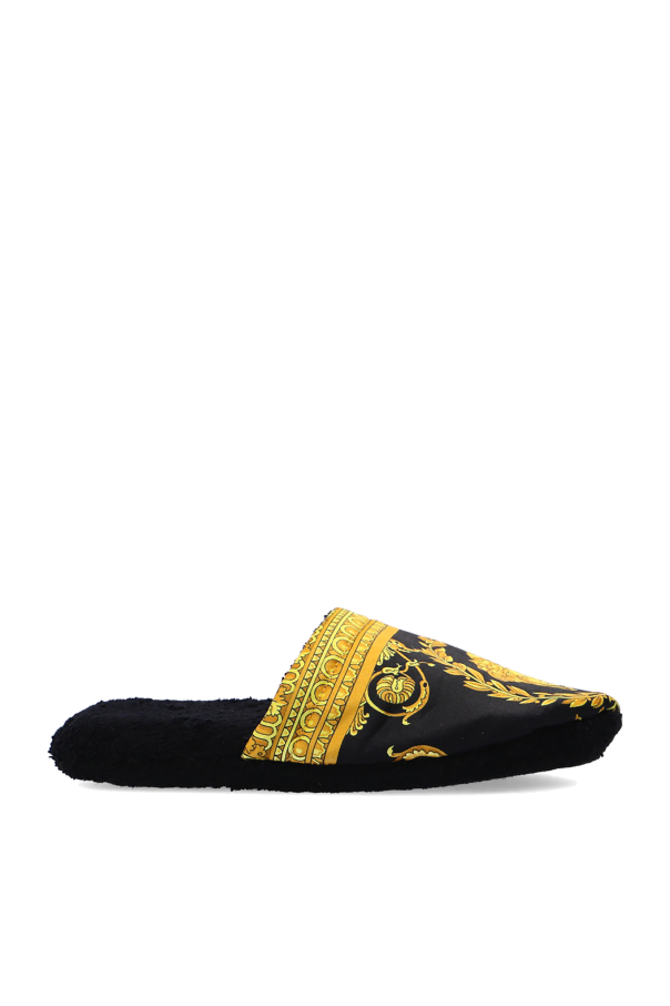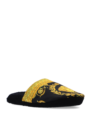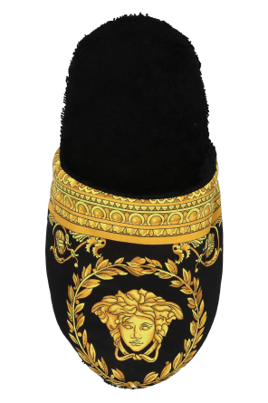 Versace Home的黑色棉质拖鞋,饰以标志性的金色图案。