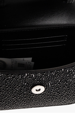 Black shoulder bag from Versace. Made of fabric and leather, this model features a magnetic snap closure, logo detail, half-round handle, detachable shoulder strap, dark silver-tone metal hardware and one internal compartment with three card slots.