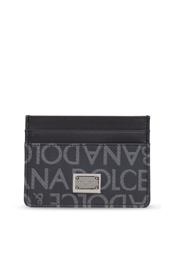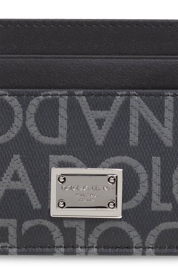 Black and grey card holder from Dolce & Gabbana. Made of calf leather, this item features a pattern, logo detail, four card slots, one internal compartment and silver-tone metal hardware.