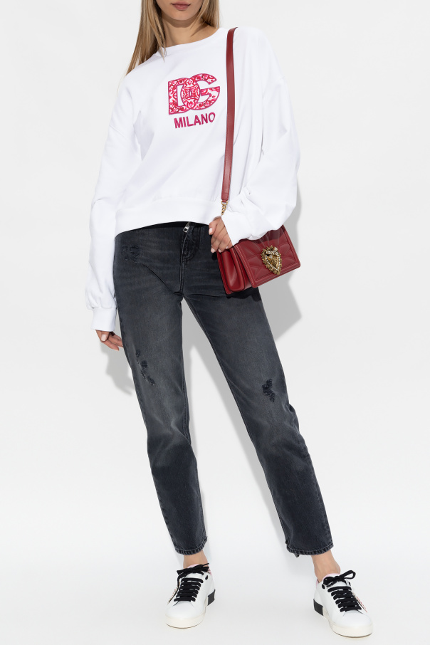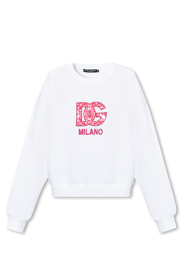 Dolce & Gabbana 的白色圆领运动衫,长袖设计,采用棉质精制而成,下摆和袖口饰有彩色徽标贴片和罗纹饰边。