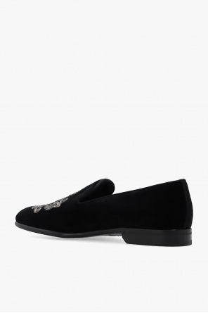 Dolce & Gabbana的黑色乐福鞋,采用天鹅绒制成,饰有装饰性徽标刺绣、闪亮贴花和黑色皮革鞋底。
