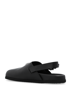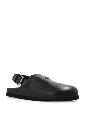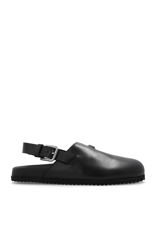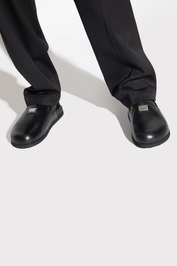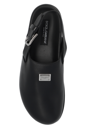 Black shoes from Dolce & Gabbana. Made of leather with a round toe, this model sits on a black rubber sole and features an adjustable buckle strap, open heel and silver-tone logo hardware on the front.