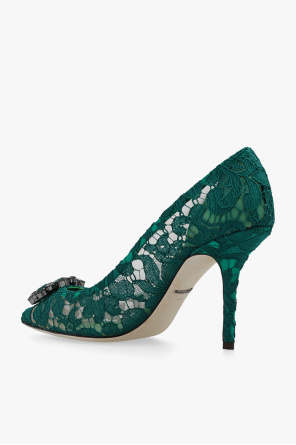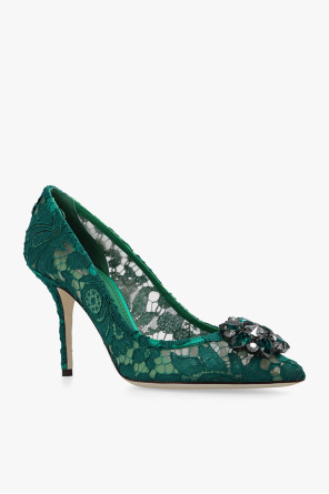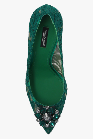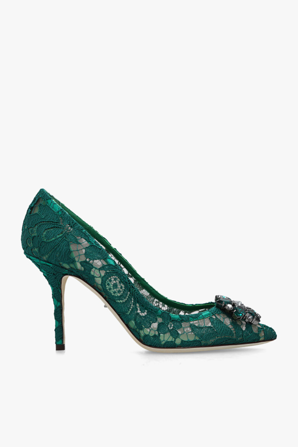 Green ‘Bellucci’ stiletto pumps from Dolce & Gabbana. Rendered in lace, this model sits on a cream leather sole and showcases a pointed toe silhouette with a crystal-embellished application on the front.