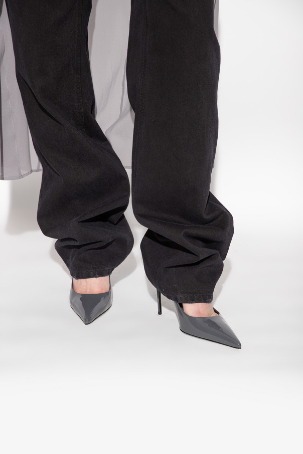 Dark grey ‘Lollo’ stiletto pumps from Dolce & Gabbana x Kim. Resting on a black leather sole, this pair features a pointed toe and heel with a metal logo detail.