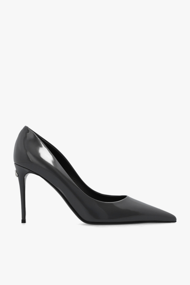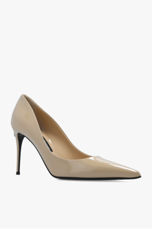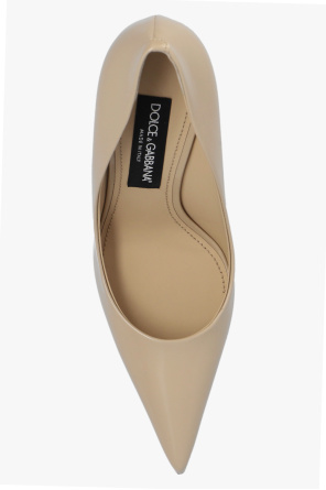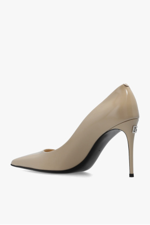 Beige ‘Lollo’ stiletto pumps from Dolce & Gabbana x Kim. Crafted from leather with a pointed toe silhouette, this model sits on a black leather sole and showcases logo hardware on the heel.