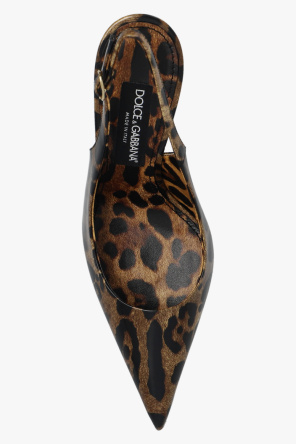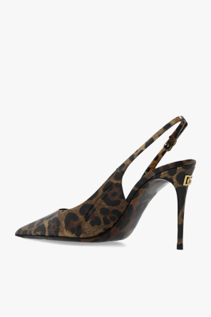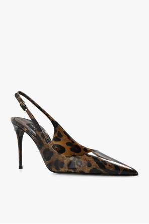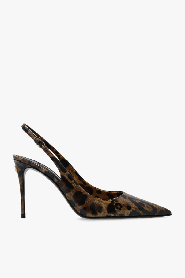 Beige, brown and black ‘Lollo’ pumps from Dolce & Gabbana x Kim. Made of patent calf leather and decorated with an animal motif, this model sits on a beige, brown and black leather sole and features a pointed toe silhouette with an adjustable buckle strap at the back and gold-tone logo hardware on the heel.