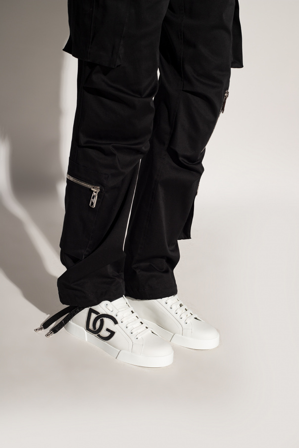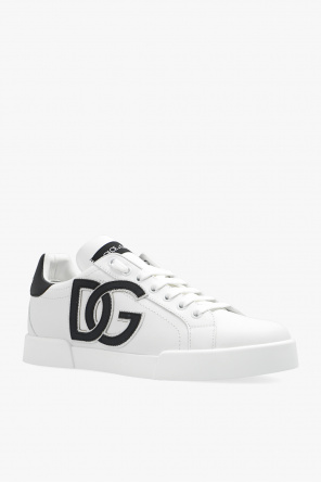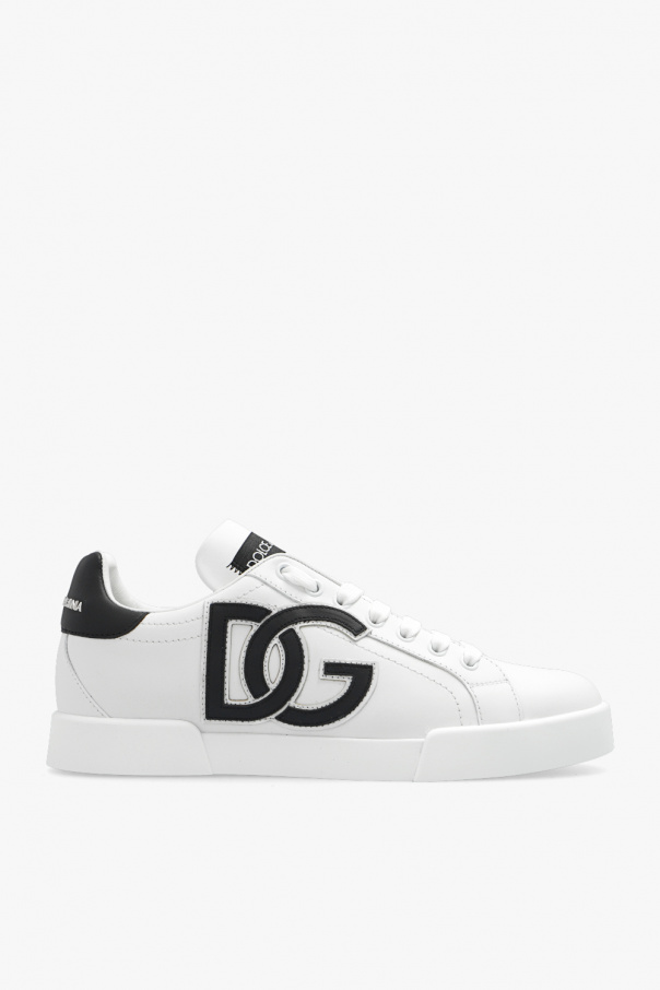 White ‘Portofino’ sneakers from Dolce & Gabbana. Made of calf leather, this lace-up pair feature black logo patches, silver-tone metal appliqué and white rubber sole.
