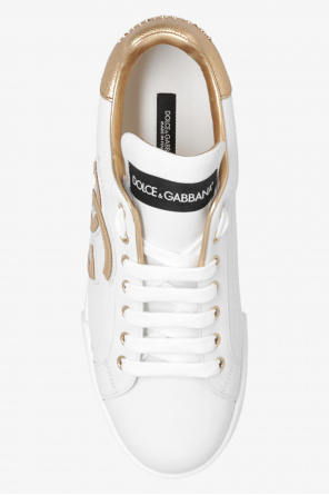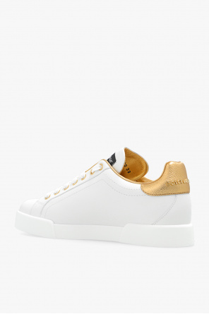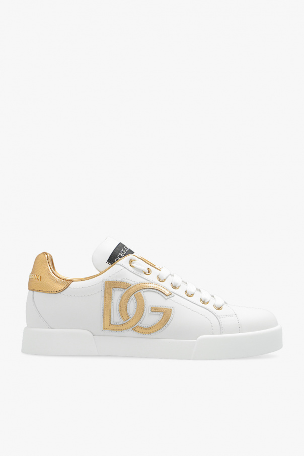 White and gold-tone ‘Portofino’ sneakers from Dolce & Gabbana. Crafted from leather, this pair is complete with a black logo patch, DG motif, metallic heel counter with a metal appliqué and white rubber sole.