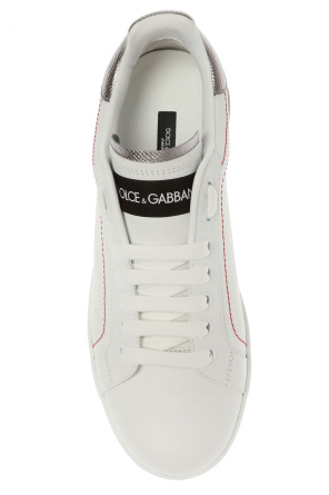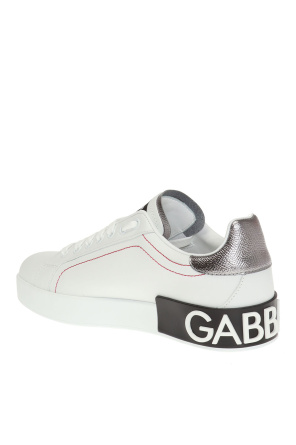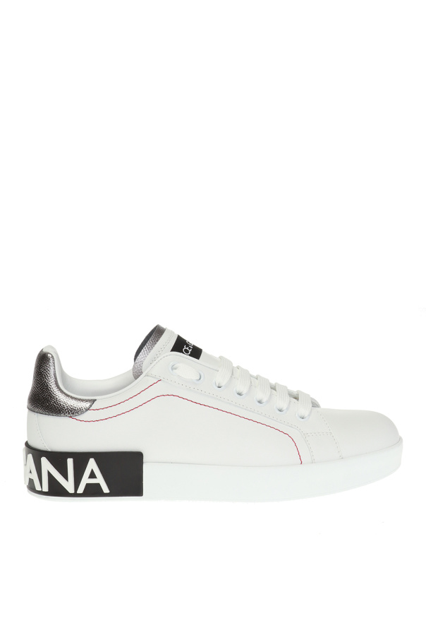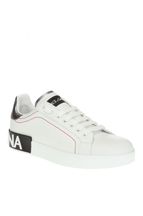 杜嘉班纳(Dolce&Gabbana)白色系带运动鞋。皮革制成。饰有黑色和白色徽标贴花,银色装饰和红色拼接细节。白色橡胶鞋底。