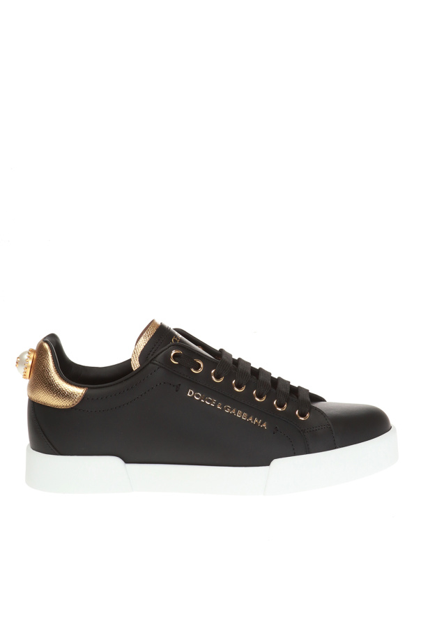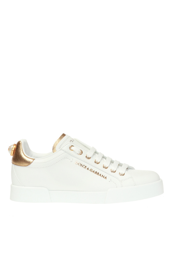 Dolce & Gabbana的白色Portofino系带运动鞋,饰以带金色logo细节的粉色纹理元素。白色橡胶鞋底。