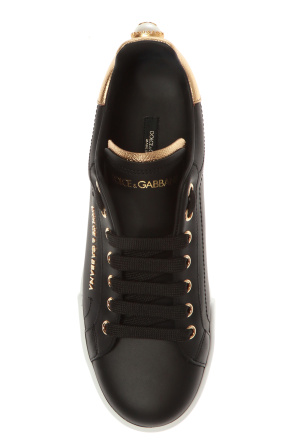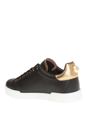 这款黑色真皮系带运动鞋来自Dolce & Gabbana,饰以金属标识与金色拼接。后面搭配圆形贴花。白色橡胶鞋底。
