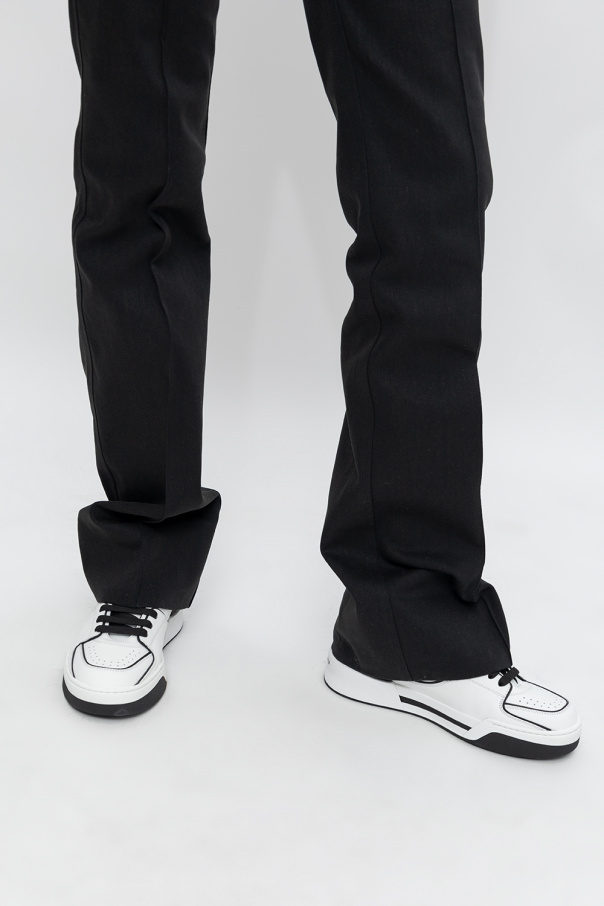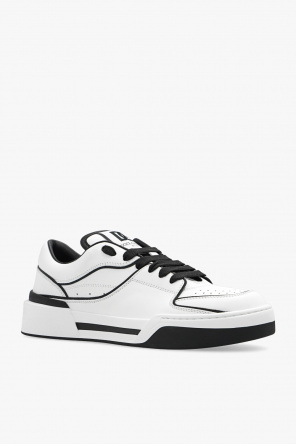 White and black ‘New Roma’ sneakers from Dolce & Gabbana. Crafted from leather, this lace-up pair features a tongue patch with a logo, perforations and rubber sole in white and black.
