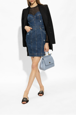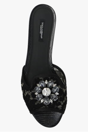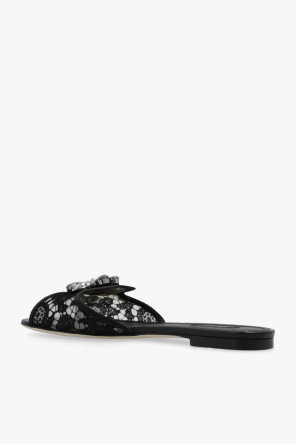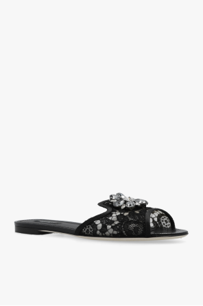 Black lace slides from Dolce & Gabbana. Made of fabric and leather, this pair rests on a beige leather sole.