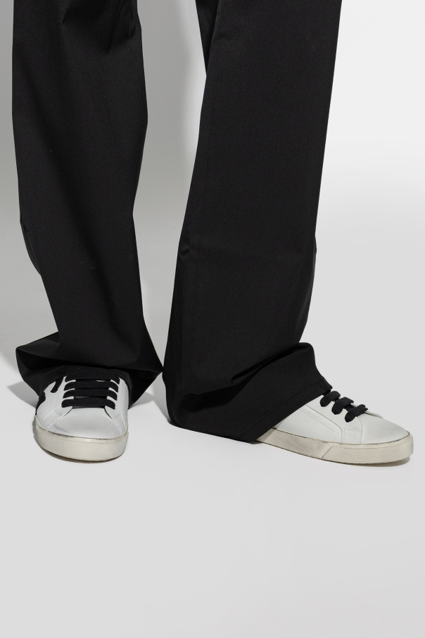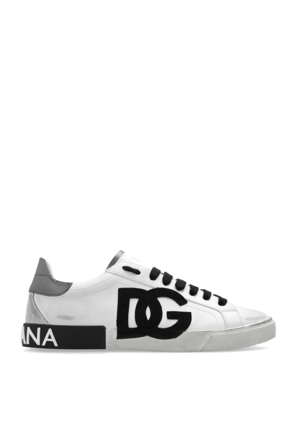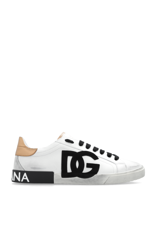 White and grey ‘Portofino’ lace-up sneakers from Dolce & Gabbana. Made of leather, this pair features a gold-tone logo print, a black logo patch, rubber sole in white and black as well as a vintage effect.