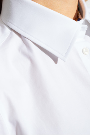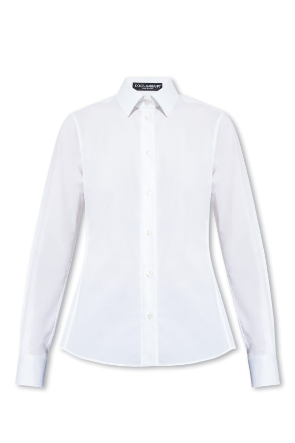 Dolce & Gabbana的白色衬衫,采用棉质面料制成,贴身设计,纽扣开合,领口为立领,长袖配有纽扣袖口。