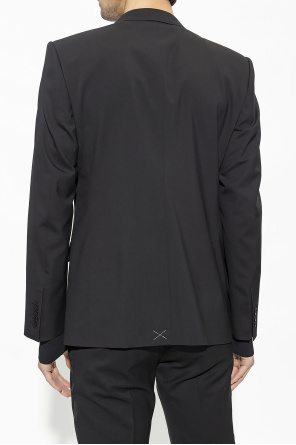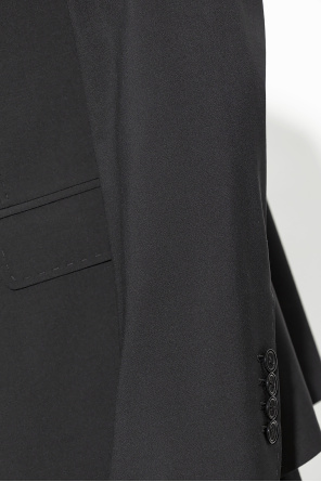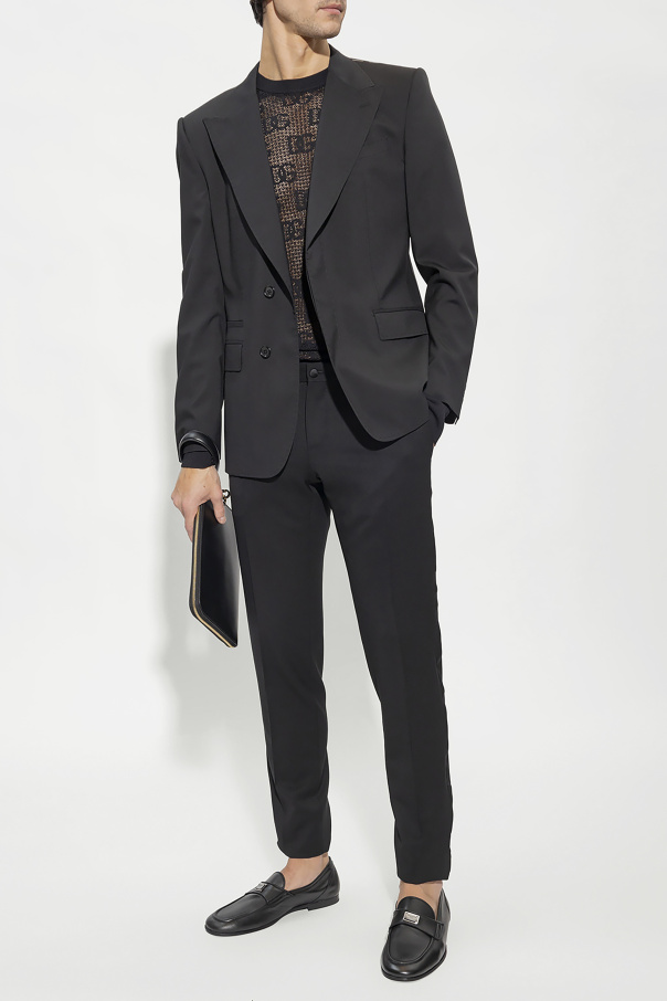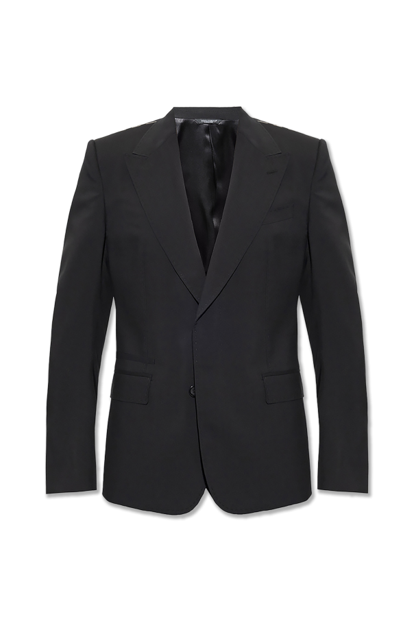 Black blazer from Dolce & Gabbana. Crafted from wool, this style fastens with buttons and features padded shoulders, peak lapels, white stitching details, three slip pockets, long sleeves and a single back vent.