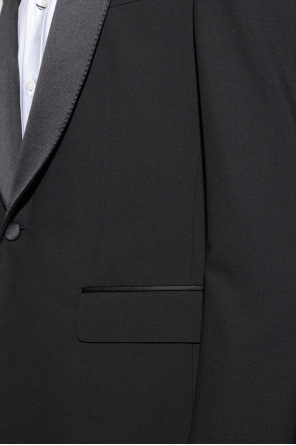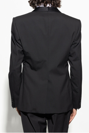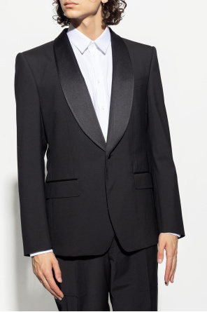 Black blazer from Dolce & Gabbana. Made of wool with a single-breasted silhouette, this style fastens with buttons and features a shawl collar with satin-blend lapels, one welt pocket, two flapped pockets and long sleeves with button cuffs.