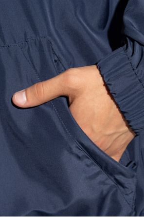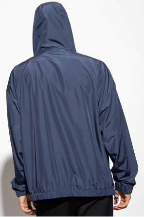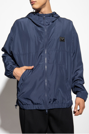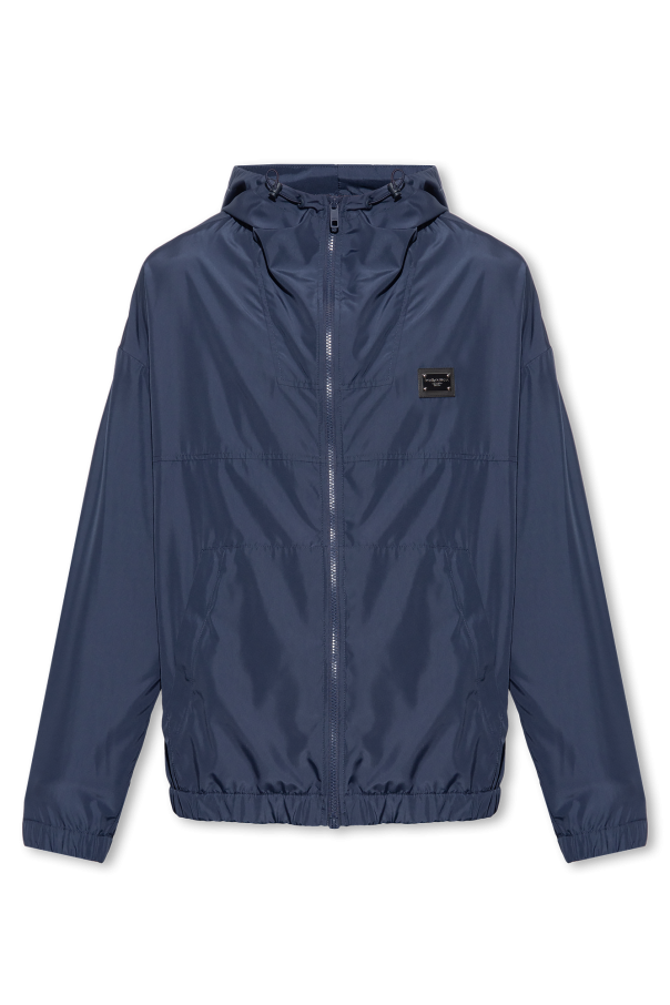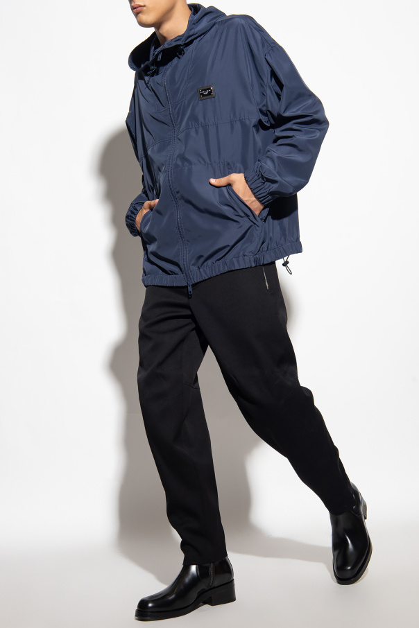 Navy loose-fitting track jacket from Dolce & Gabbana. Fastened with a two-way zip, this garment features two zip pockets, a metal logo-embossed insert in silver-tone, drawstring hood and hem as well as elasticated cuffs.