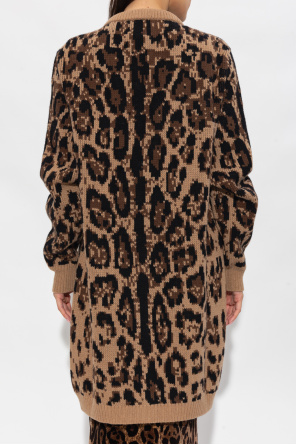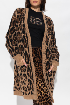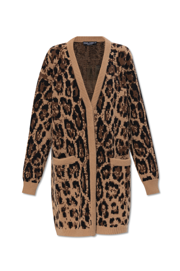 Dolce & Gabbana 的棕色和黑色开衫,采用羊绒和羊毛混纺面料制成,饰有提花豹纹图案,配有 V 领、按扣、长袖和罗纹边。