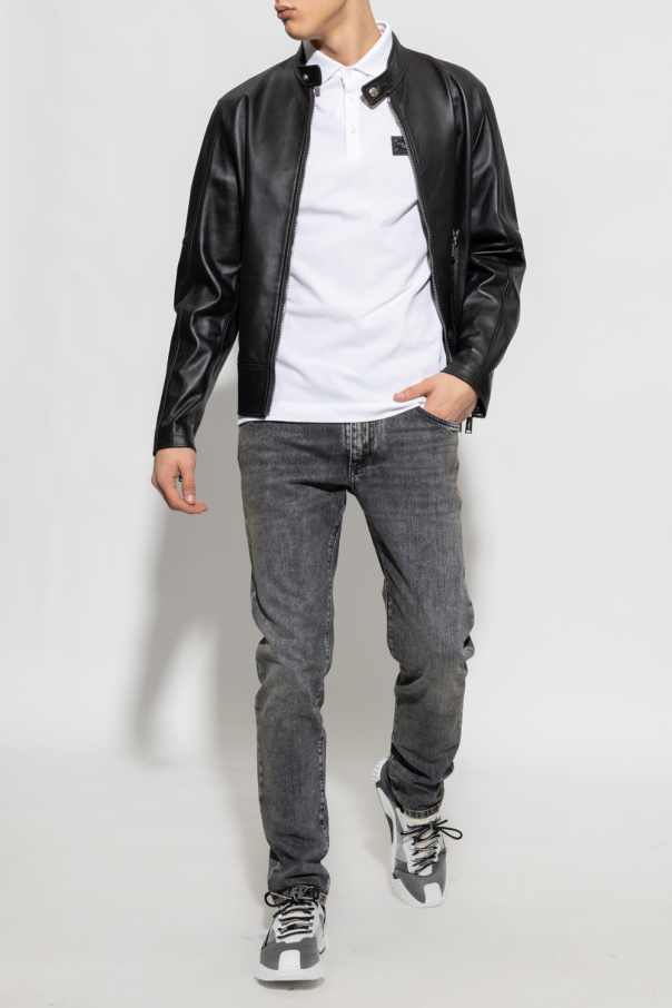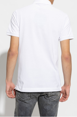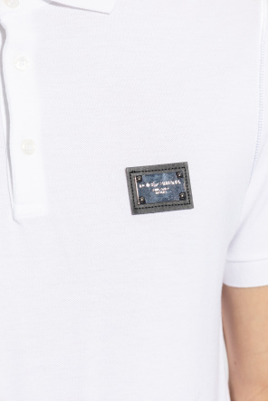 Dolce & Gabbana的白色棉质polo衫。附纽扣衣领、侧开衩、短袖。正面饰有黑色和银色徽标贴花。
