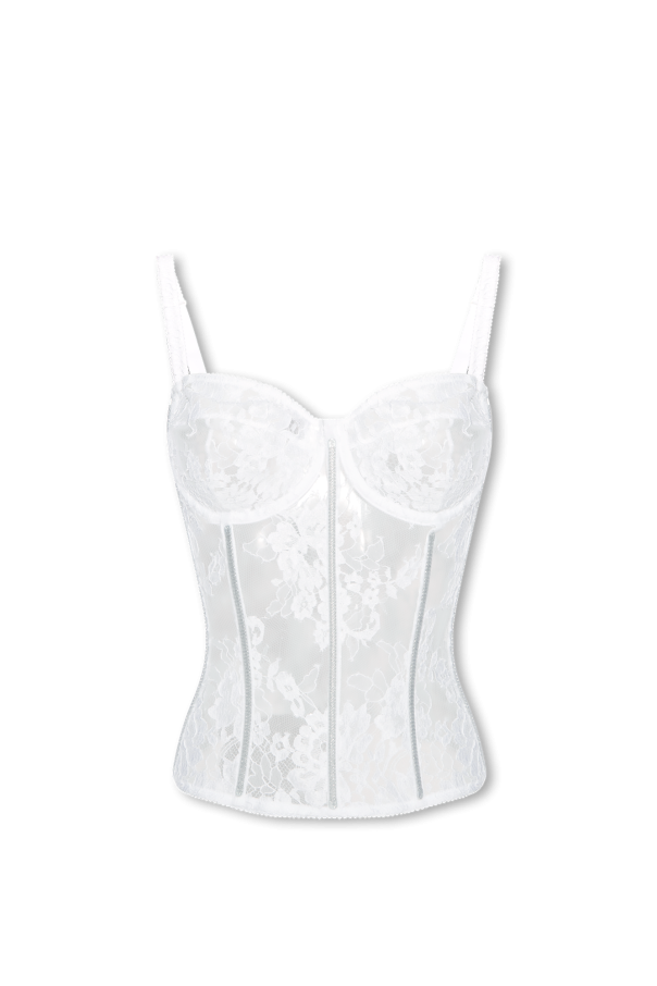 White lace top with adjustable shoulder straps from Dolce & Gabbana. Fastened with a back zip, this corset design features boning and metal details.