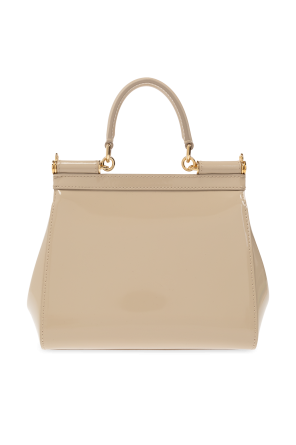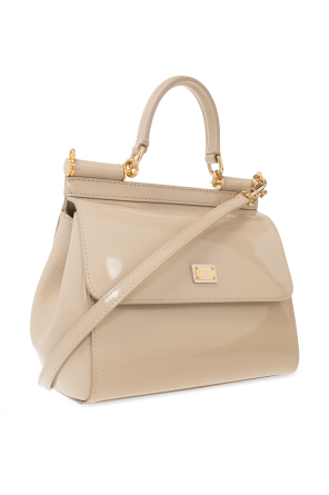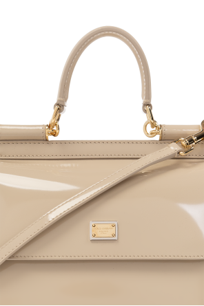 Light beige ‘Sicily Medium’ shoulder bag from Dolce & Gabbana. Crafted from patent calf leather, this model features a snap closure, logo-engraved metal detail, half-round handle, detachable and adjustable shoulder strap, gold-tone metal hardware and one internal compartment with one slip pocket and one card slot.