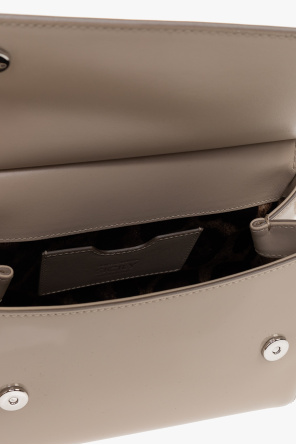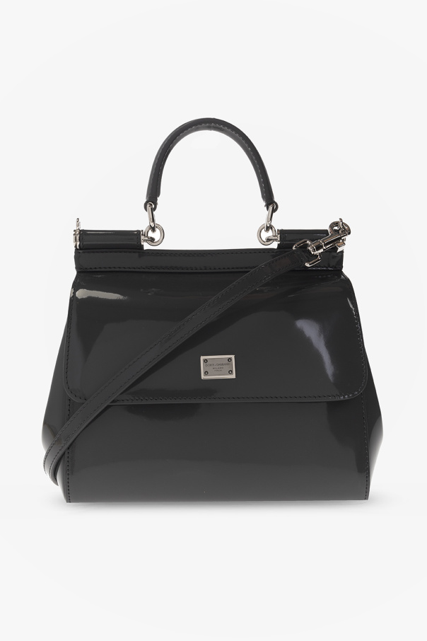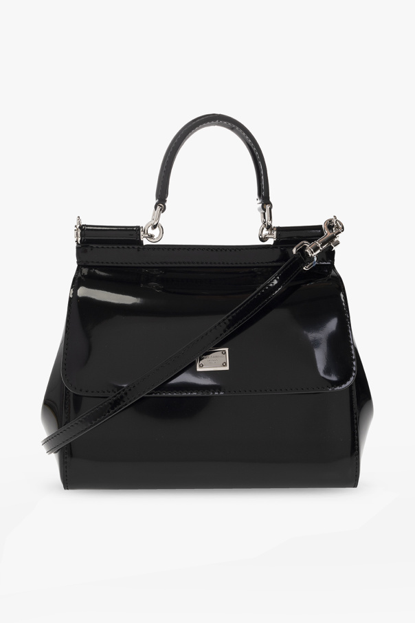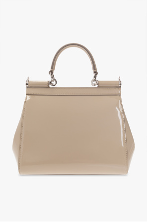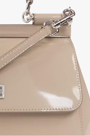 Beige ‘Sicily’ shoulder bag from Dolce & Gabbana x Kim. Crafted from patent leather, this design fastens with snaps and showcases a logo-engraved metal application on the front. It is complete with a half-round handle, a detachable and adjustable shoulder strap, silver-tone metal hardware and one internal compartment with one slip pocket and one card slot.
